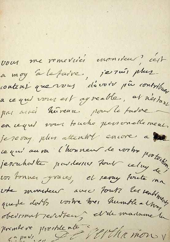 François-Michel de Verthamon (1657?-1738), conseiller au parlement de Paris, premier prédisent du Grand Conseil. L.A.S., Paris, 6 novembre 1700, 1p in-4. « Vous me remerciez, Monsieur, c'est à moi de la faire, je suis plus content que vous d'avoir pu contribuer à ce qui vous est agréable, et n'étant pas assez heureux pour le faire en ce qui vous touche personnellement, je ne vais plus attendre encore à ce que aura l'honneur de votre protection ; je souhaite par dessus tout celui de vos bonnes grâces, et serai toute ma vie, Monsieur, avec tous les sentiments que je dois, votre très humble et très obéissant serviteur, et de madame la première présidente. De Verthamon ». Peu commun. [95-2]