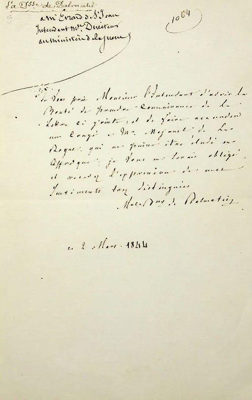 Jeanne-Louis-Elisabeth Berg (1771-1852), duchesse de Dalmatie, épouse de Jean-de-Dieu Soult, duc de Dalmatie, maréchal de France. L.A.S., 2 mars 1844, 1p in-8. Selon une note, à M. Evrard de Saint Jean, afin d'obtenir un congé pour M. Méjanel de la Roque. [95-2]