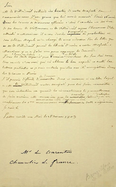 Charles de Paule de Barentin (1738-1819), magistrat, Garde des Sceaux en 1788-1789. L.A. (brouillon), 25 août 1803, 1p in-8. Intéressante lettre au roi Louis XVIII, alors en exil, afin de lui recommander Pierre-Charles Laurent de Villedeuil (1742-1828), contrôleur général des finances de Louis XVI. « Sire, M. de Villedeuil sollicite des bontés de votre majesté sa reconnaissance d'une grâce que lui avait accordé Louis 16 mais dont les traces se trouvent effacées. C'était l'élection en marquisat de ses terres de Villemenon et de Villedeuil. Ayant l'honneur d'être attaché à Monsieur [le futur Charles X], il a cru devoir s'enquérir de la protection et son Altesse Royale m'a chargé de vous adresser, Sire, la lettre que M. de Villedeuil prend la liberté d'écrire à votre majesté. Monsieur y en a joint une pour appuyer la demande. Tous les faits exposés dans sa lettre un ancien et fidèle serviteur du feu roi sont très [mot illisible], c'est moi qui ai obtenu le bon expédié et scellé des lettres patentes et je suis certain qu'elles ont été enregistrées dans les 3 cours de Paris. S'il parait difficile de donner dans ce moment-ci un titre loyal à M de Villedeuil, votre majesté peut lui faire connaître que son intention est, quand les circonstances le permettront, de faire revivre cette concession par de secondes lettres patentes qui en confirment les premières [fin difficile à lire] ». Beau document. [95-2]