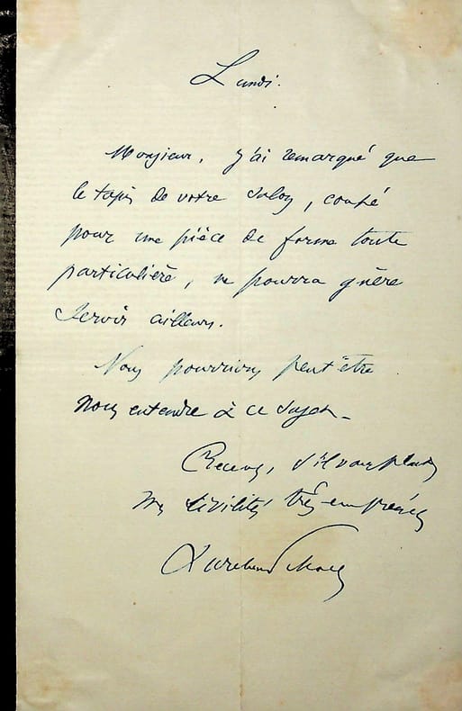 Aurélien Scholl (1833-1902), écrivain, journaliste. L.A.S., sd [lundi], 1p in-8. A propos d'un tapis de son correspondant qui l'intéresse. [95-2]