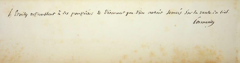 Louis Marie de Lahaye de Cormenin (1788-1868), écrivain, homme politique. P.A.S., sd, 1p in-8 oblong. Pensée autographe : « Les Etoiles ressemblent à des poussières de diamant que Dieu aurait semées sur sa route en lied. Cormenin ». Rare. [95-2]