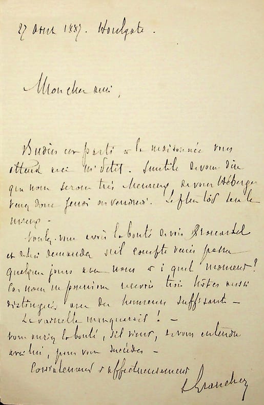 Jacques-Joseph Grancher (1843-1907), médecin, pédiatre, participe avec Louis Pasteur à la première vaccination contre la rage. L.A.S., Houlgate, 23 août [1887], 1p 1/2 in-8. Au docteur Georges Daremberg (1850-1907) : « Mon cher ami, Nous voici ici depuis 20 jours et je vais mieux mais il me faut encore du repos et de l'air pur, et de l'exercice « modéré » pour retrouver mon appétit, ma digestion, et mon sommeil, je ne dis pas d'autrefois mais d'hier. Quand viendrez-vous nous voir ? [Pierre-Constant] Budin est ici depuis mercredi dernier et nous le garderons encore quelques jours. Voulez-vous vous entendre avec M. [Léon] Petit que j'ai invité à venir passer quelques jours avec nous ? Si vous veniez ensemble, il faudrait attendre le départ de Budin que je vous annoncerai par dépêche ou par lettre. Vous auriez alors deux chambres voisines, à un étage particulier, avec un escalier pour vous deux. Bref vous seriez comme un jeune ménage. Ca vous va-t-il ? En attendant, voulez-vous accepter la loge de ma femme à l'opéra pour vendredi prochain 26 ? Vous pouvez y conduite cinq messieurs ou cinq dames décolletées & vertueuses. Cette carte présentée au contrôle sera votre sésame. Si vous n'acceptez pas, seriez-vous assez bon de me le dire par dépêche pour que j'ai le temps d'envoyer la loge à quelqu'autre ami ? Cordialement à vous. J Grancher. P.S. : j'ai lu votre article sur le surmenage dans les débats. Il était fort bien ». L'article cité est dans le Journal des Débats du 15 août 1887. Budin est un autre pédiatre, Petit est aussi un médecin. Autographe rare du premier médecin à avoir pratiqué le vaccin contre la rage à un humain. [95-2]