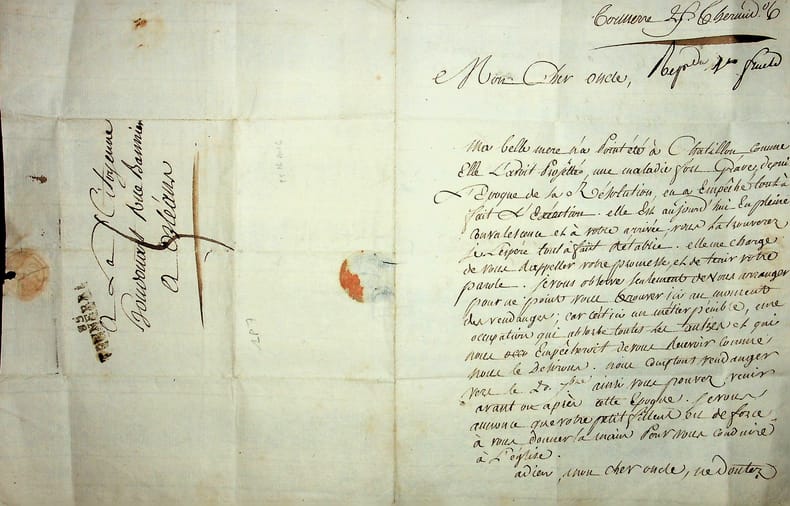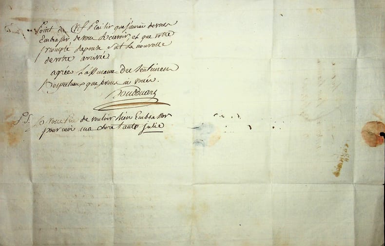 François-Robert Houdouart (1761-1810), homme politique, député de l'Yonne, ingénieur des Ponts-et-Chaussées. L.A.S., Tonnerre, 25 thermidor an 6 [13 août 1798], 1p 1/2 in-4. A son oncle à Orléans [mais l'adresse indique « à la citoyenne Houdouart » i.e. sa tante Julie]. Lettre familiale à propos d'une visite prévue de son oncle à Tonnerre (d'où est originale la famille de sa femme). Sa belle-mère a eu une « maladie fort grave » et il espère qu'elle sera guérie quand son oncle viendra. Il lui demande de ne pas venir pendant les vendanges : « c'est ici un métier pénible, une occupation qui absorbe toutes les autres et qui nous empêcherait de vous recevoir comme mous le devrions ». Ces vendanges sont prévues vers le 20 septembre. Peu commun. [94-2]