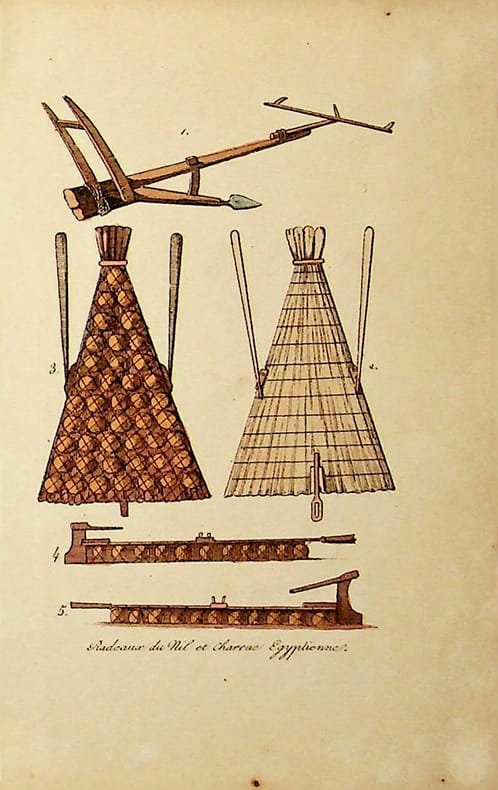 [Gravure tirée de] Breton de la Martinière, Radeaux du Nil et Charrue Egyptienne [gravure tirée de L'Égypte et la Syrie, ou moeurs, usages, costumes et monumens des Égyptiens, des Arabes et des Syriens. Précédé d'un Précis historique]. 1814, environ 135*85mm. Gravure en couleurs. Petites traces de collage au dos. [94-2]
