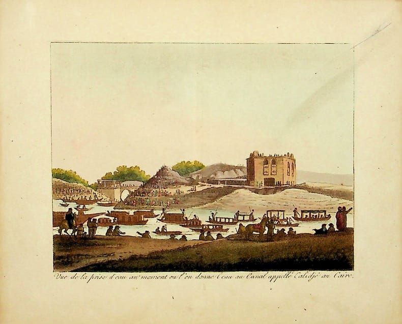 [Gravure tirée de] Breton de la Martinière, Vue de la prise d'eau au moment où l'on donne l'eau du canal appelé Calidjé au Caire [gravure tirée de L'Égypte et la Syrie, ou moeurs, usages, costumes et monumens des Égyptiens, des Arabes et des Syriens. Précédé d'un Précis historique]. 1814, environ 135*165mm. Gravure en couleurs. Petites traces de collage au dos. Pli d'origine. [96-2]