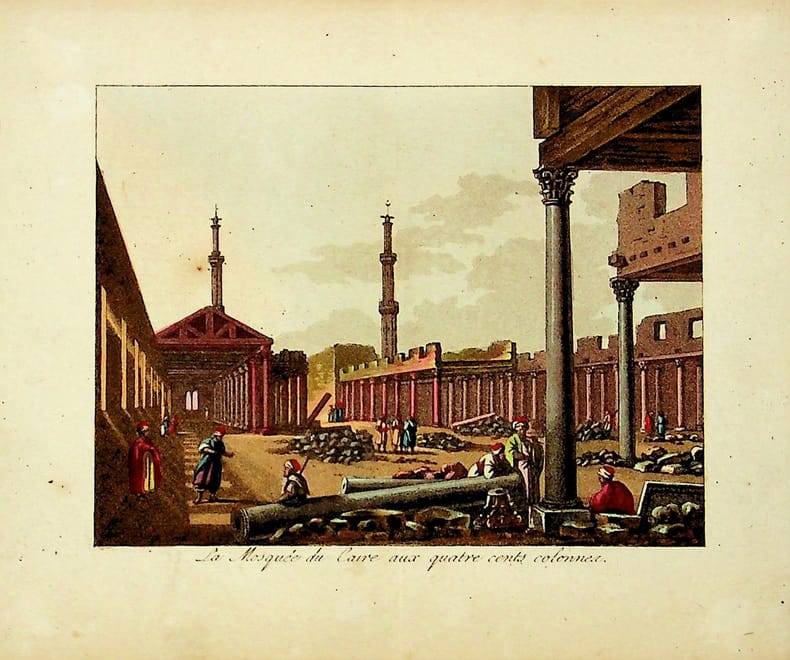 [Gravure tirée de] Breton de la Martinière, La Mosquée du Caire aux quatre cents colonnes [gravure tirée de L'Égypte et la Syrie, ou moeurs, usages, costumes et monumens des Égyptiens, des Arabes et des Syriens. Précédé d'un Précis historique]. 1814, environ 135*165mm. Gravure en couleurs. Petites traces de collage au dos. Pli d'origine. [96-2]
