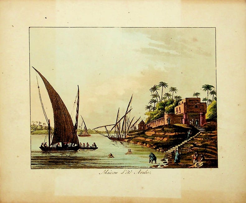 [Gravure tirée de] Breton de la Martinière, Maison d'été Arabe [gravure tirée de L'Égypte et la Syrie, ou moeurs, usages, costumes et monumens des Égyptiens, des Arabes et des Syriens. Précédé d'un Précis historique]. 1814, environ 135*165mm. Gravure en couleurs. Petites traces de collage au dos. Pli d'origine. [96-2]