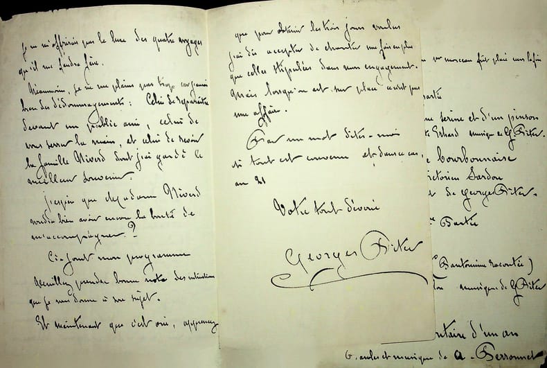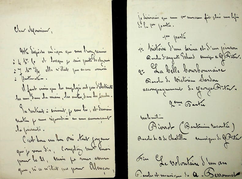 Georges Piter (?-1910), compositeur, chanteur de café concert. L.A.S., sd [avant le 3 juin 1879], 4p in-8. Au magistrat d'Alençon Charles Monguilan (1834-1912). Longue lettre pour accepter le concert du 21 juin 1879. La 4e page est un feuillet seul avec un projet de programme. Papier un peu abimé en bordure de la lettre. [96-2]