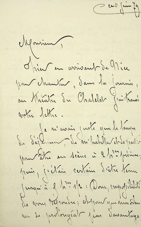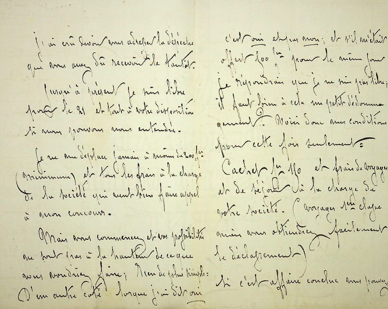 Georges Piter (?-1910), compositeur, chanteur de café concert. L.A.S., 2? juin 1879, 4p in-8. Au magistrat d'Alençon Charles Monguilan (1834-1912). Longue lettre pour donner ses conditions pour un concert. Ils feront ce concert le 21 juin. [96-2]
