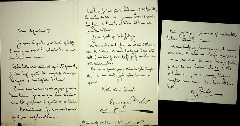Georges Piter (?-1910), compositeur, chanteur de café concert. L.A.S., Paris, 27 avril 1881, 2p in-8 et 1p in-12. Au magistrat d'Alençon Charles Monguilan (1834-1912). A propos d'un concert que Monguilan essaie d'organiser. Papier affaibli en marge basse. On joint les copies de 3 télégrammes envoyées par Piter. [96-2]