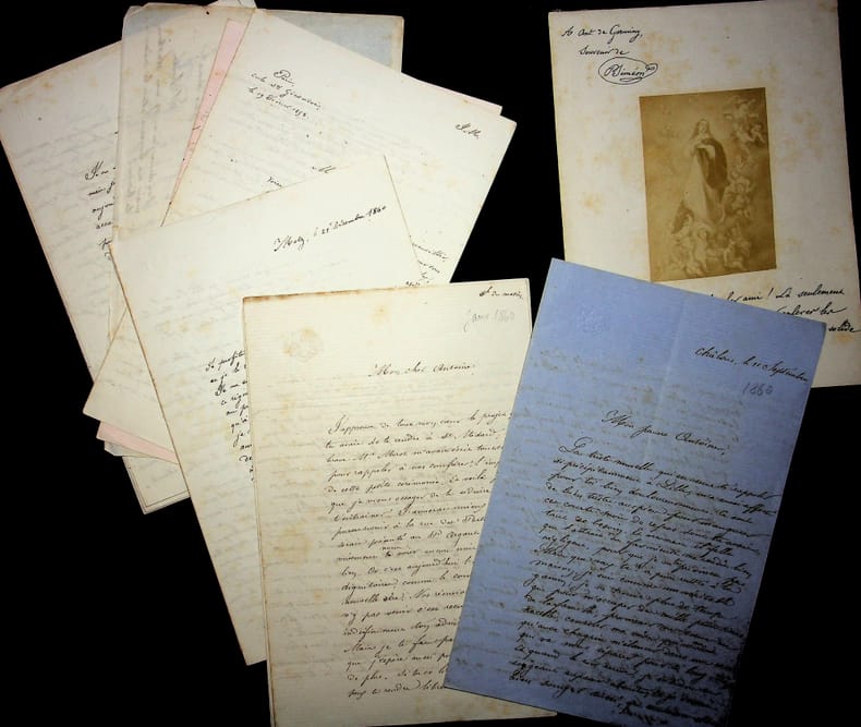 Paul Siméon (1838-1922), polytechnicien, officier, ingénieur, précepteur des enfants de la duchesse de Parme, choisi par le comte de Chambord, frère de la duchesse. 12 L.A.S., 1858-1862, environ 38p in-8. A Antoine de Germiny (1840-1918), polytechnicien, général. Longue et jolie correspondance amicale commençant quand ils sont encore étudiants et se terminant quand Siméon est à Metz. On joint une photo d'un tableau religieux, une assomption, avec une dédicace de Siméon à Germiny et une pensée religieux. Siméon démissionne en 1862, semble-t-il pour devenir précepteur. Bel ensemble. [96-2]