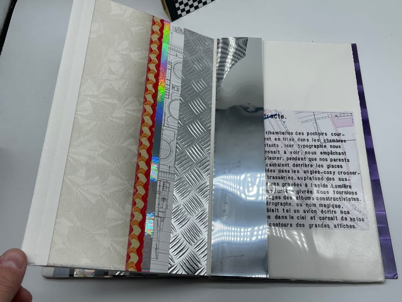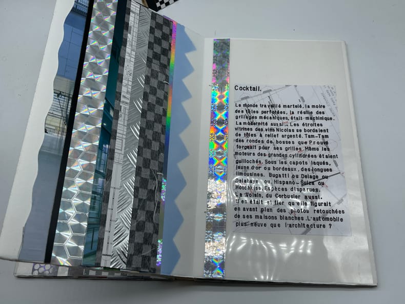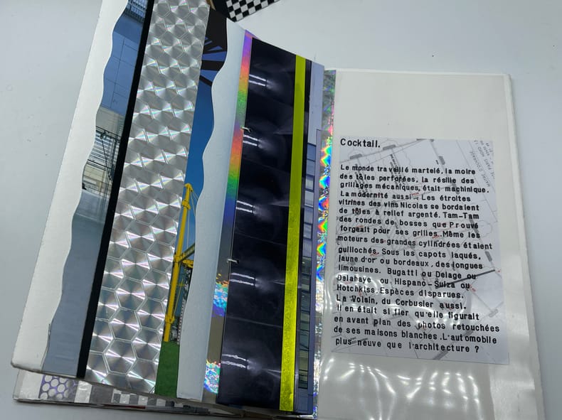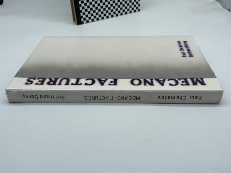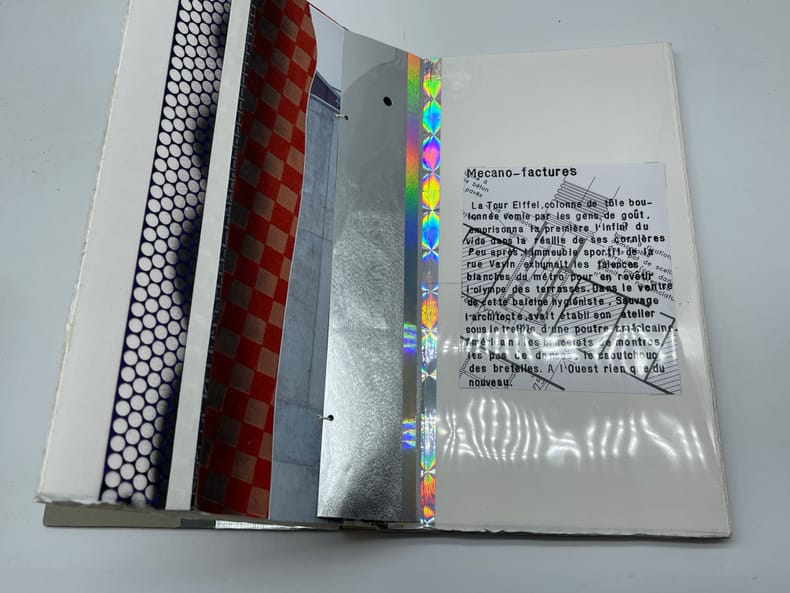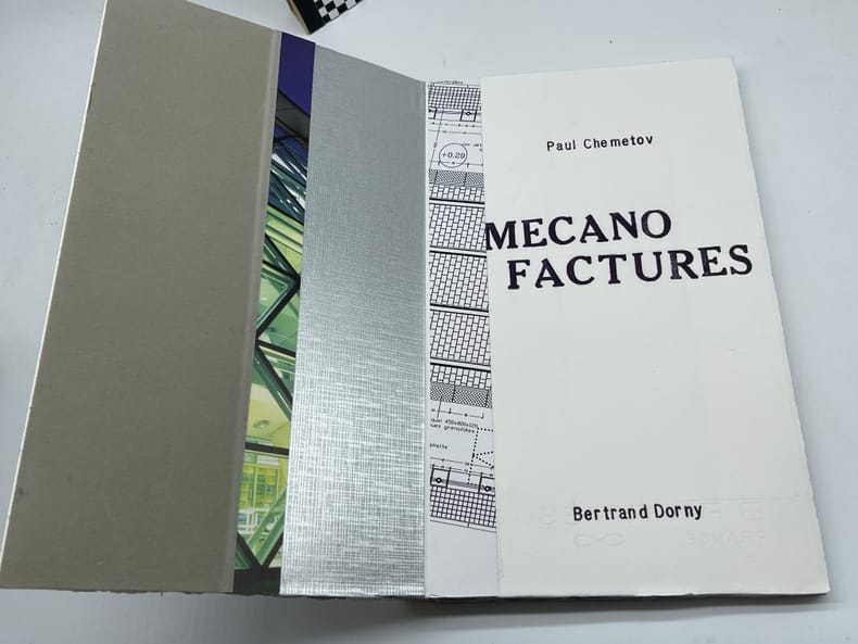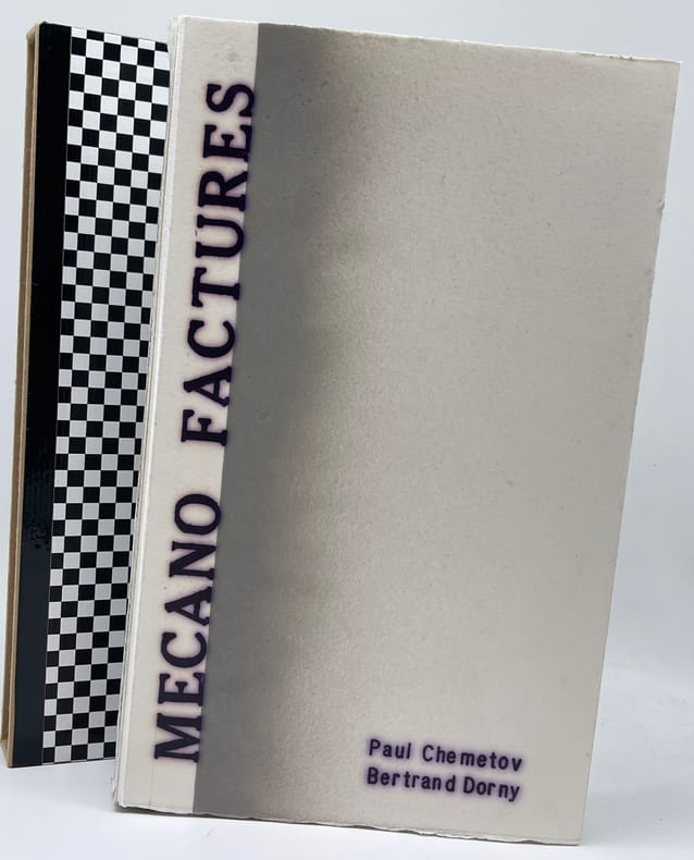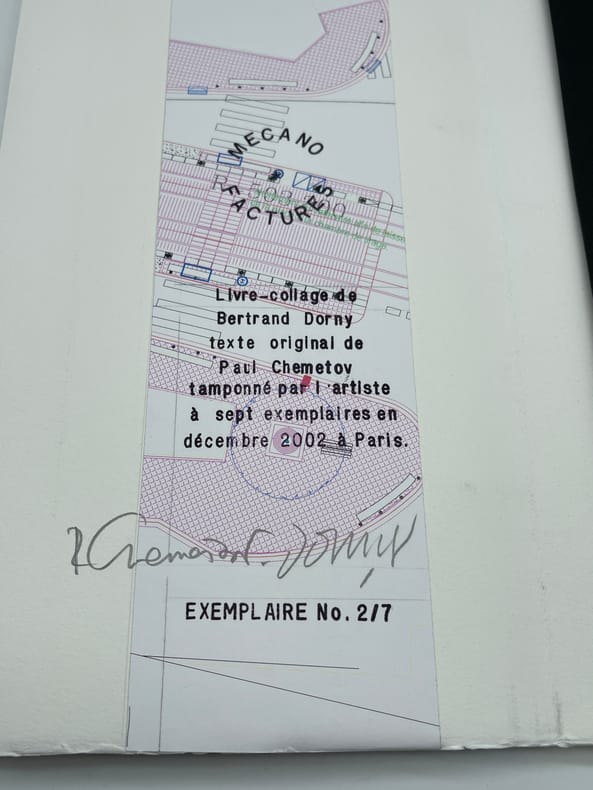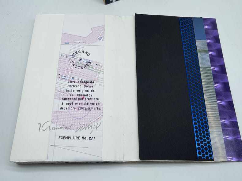 Paul Chemetov ; Bertrand Dorny (illustrateur), Mecano-factures. Paris, s.n., 2002. 28*18cm environ, 9f papier et Plexiglas. Ouvrage tiré à 7 exemplaires (n°2/7), signé au crayon à la justification par Chemetov et Dorny. L'ouvrage contient 4 textes de Chemetov, imprimée sur Plexiglas : Mecano-factures, Cocktail, Entracte et un derniers non titré commençant par « Dubon, Dubon, Dubonnet ». Les autres feuillets ont des collages de Dorny, mêlant photos, impressions diverses, bandes réfléchissantes, métalliques, plans, etc. Couverture titrée au pochoir sur le premier plat et avec une bande collante sur le dos. En feuilles montées en accordéon, sous couverture et étui assorti. Mis à part le titre du dos légèrement décollé, très bel état. Rare.