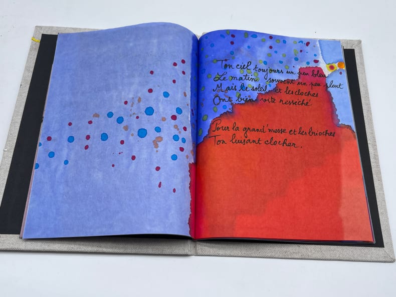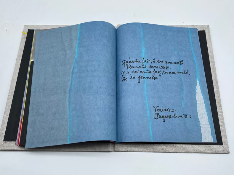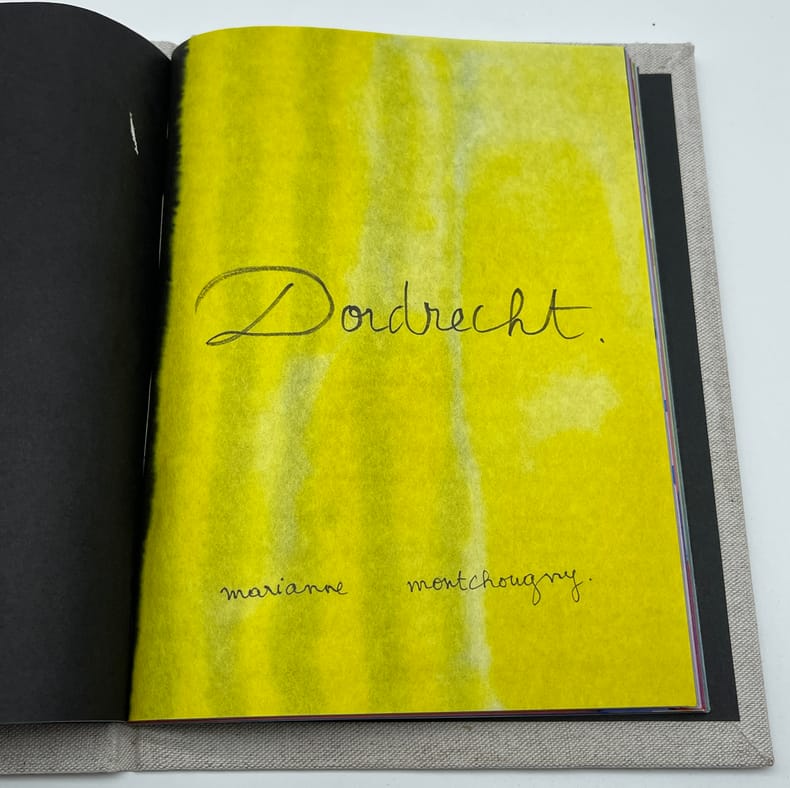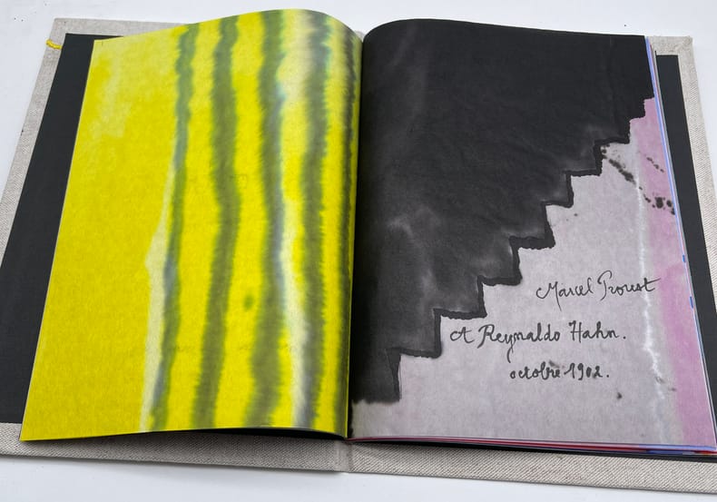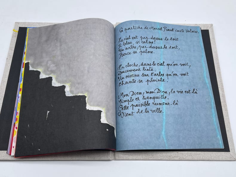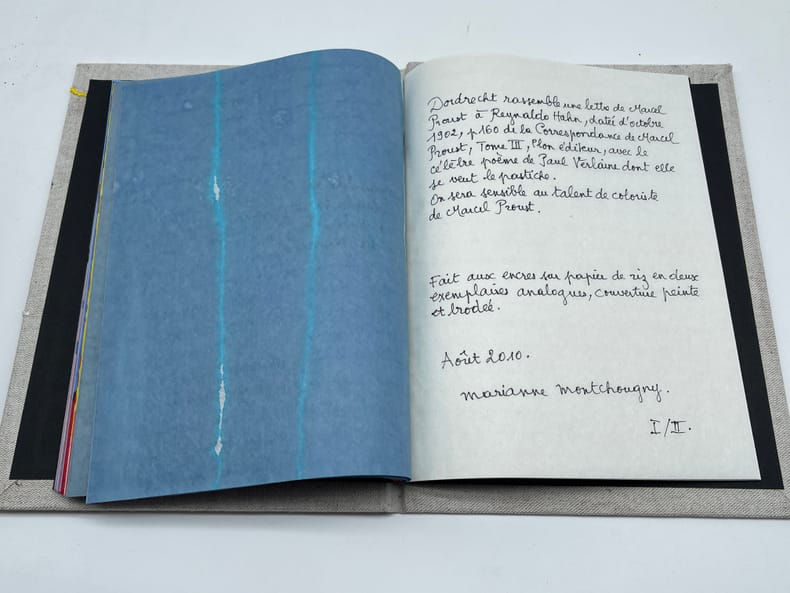 Marcel Proust; Paul Verlaine ; Marianne Montchougny (illustratrice), Dordrecht - Lettre de Marcel Proust à Reynaldo Hahn et Poème de Verlaine tiré de Sagesse. S.l., Marianne Montchougny, août 2010. 248*188mm, 28p. Illustré entièrement original, fait à 2 exemplaires, n°I/II. Sur papier de riz, entièrement aquarellé et manuscrit par Marianne Montchougny. Le texte reproduit donc une lettre d'octobre 1902 de Proust à Reynaldo Hahn, contenant un poème qui se veut le pastiche d'un poème de Verlaine (Sagesse, livre III, 6) reproduit la suite. Reliure cartonné et toilée, brodée et peinte. Très bel état. Bel ouvrage.