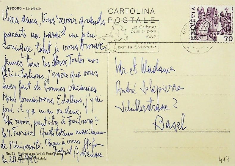 Stefan Askenase (1896-1985), pianiste polonais naturalisé belge. L.A.S., Ascona, 20 juillet 1982, 1p in-12. Au poète (et compositeur ?) suisse André Delapierre et son épouse. Courrier amical. [269]