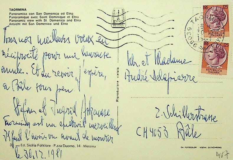 Stefan Askenase (1896-1985), pianiste polonais naturalisé belge. L.A.S., Taormina, 30 décembre 1981, 1p in-12. Au poète (et compositeur ?) suisse André Delapierre et son épouse. Courrier amical. [269]