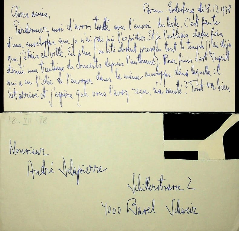 Stefan Askenase (1896-1985), pianiste polonais naturalisé belge. L.A.S.+enveloppe, 18 décembre 1978, 2p in-8 oblong. Au poète (et compositeur ?) suisse André Delapierre et son épouse. Courrier amical. [270]