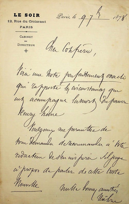 Alexandre Vührer (1817-1886), journaliste, homme de presse, économiste. L.A.S., Paris, 9 septembre 1878, 1p in-8. Entête du journal Le Soir, dont il est directeur. A l'écrivain Aurélien Scholl (1833-1902). Il lui envoie une note sur les circonstances de la mort d'Henry Heine, vraisemblablement un homonyme du poète, mort ici en 1878. Peu commun. [202-2]