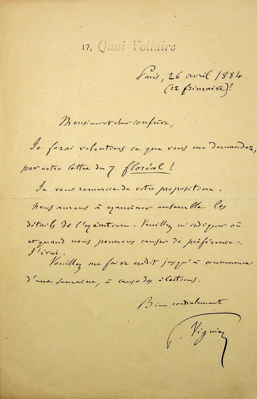 Paul-Louis Viguier (1828-1901), publiciste, journaliste, conseiller municipal du XVIIe arrondissement de Paris. L.A.S., Paris, 26 avril 1884, 1p in-8. A l'écrivain Aurélien Scholl (1833-1902). Il est d'accord avec sa lettre du 7 floréal [et date la sienne du 12 frimaire] et lui demande un rendez-vous. [202-2]