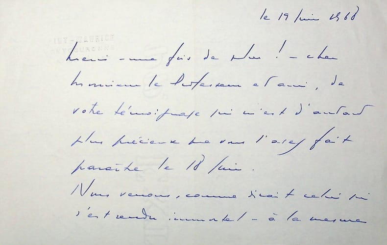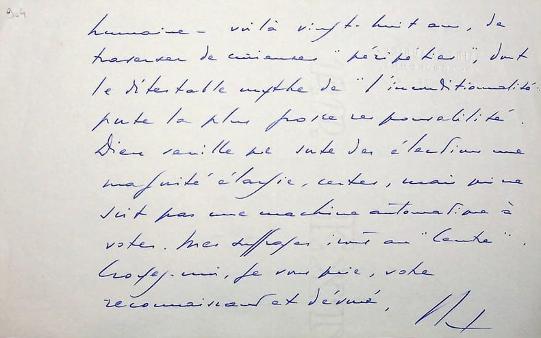 Gibert Renault dit Colonel Rémy (1904-1984), résistant. L.A.S., 19 juin 1968, 2p in-8 oblong. A l'écrivain et résistant Jean-Charles Varennes (1915-1995) sur les élections de 1968. « Merci une fois de plus ! Cher monsieur le Professeur et ami, de votre témoignage qui m'est d'autant plus précieux que vous l'avez fait paraître le 18 juin nous venons, comme disait celui qui s'est rendu immortel, à la mesure humaine, voilà vingt-huit ans, de traverser de curieuses péripéties, dont le détestable mythe de l'inconditionnalité porte la plus grande responsabilité. Dieu veuille que sorte des élections une majorité élargie, certes, mais qui ne suit pas une machine automatique à votes. Mes suffrages vont au "Centre". Croyez-moi, je vous prie, votre reconnaissant et dévoué. [signature] ». [202-2]