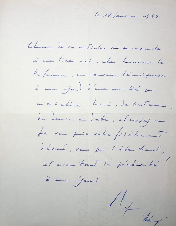 Gibert Renault dit Colonel Rémy (1904-1984), résistant. L.A.S., 28 janvier 1969, 1p in-4. A l'écrivain et résistant Jean-Charles Varennes (1915-1995). « Chacun de vos articles qui se rapporte à mes livres est, cher Monsieur le Professeur, un nouveau témoignage à mon égard d'une amitié qui m'est chère. Merci, de tout coeur, du dernier en date, et croyez-moi, je vous prie, votre fidèlement dévoué, vous qui l'êtes tant, et avec tant de générosité !, à mon égard. [signature et mention] "Remy". ». [202-2]