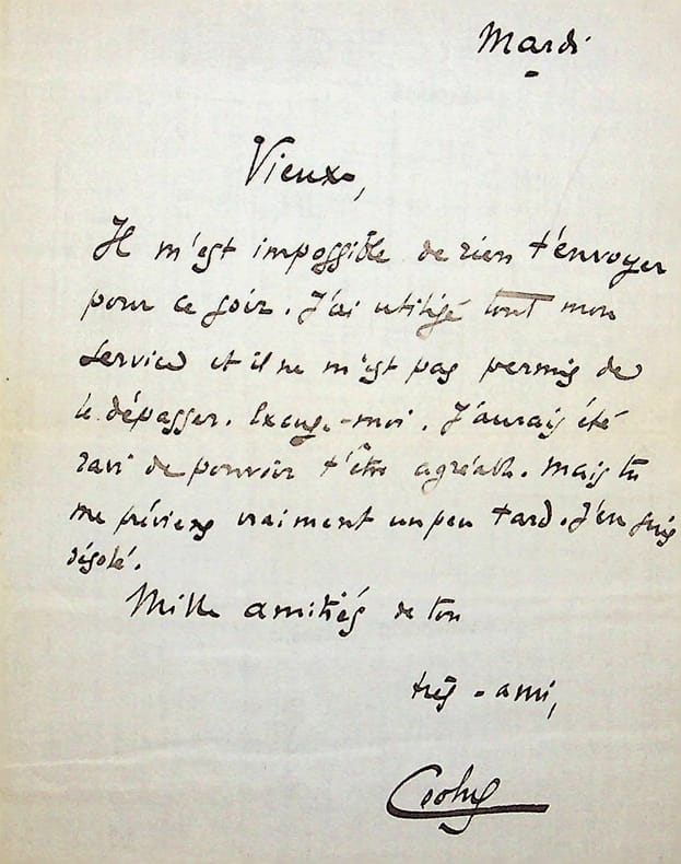 Romain Coolus (1868-1952), écrivain, scénariste. L.A.S., 24 novembre 1911, 1p in-12. A Xavier Roux (1850-19??), journaliste. Il ne peut rien envoyer pour le soir à son ami. [205]