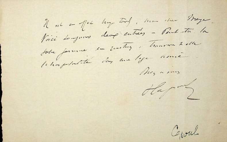 Victor Capoul (1839-1924), ténor, acteur. L.A.S., sd, 1p in-8 oblong. A l'écrivain Arthur Meyer (1844-1924). « Il est en effet trop tard, mon cher Meyer. Voici toujours deux entrées. Peut-être là votre femme en question trouvera-t-elle l'hospitalité dans une loge amie. Bien à vous. V Capoul ». [205]