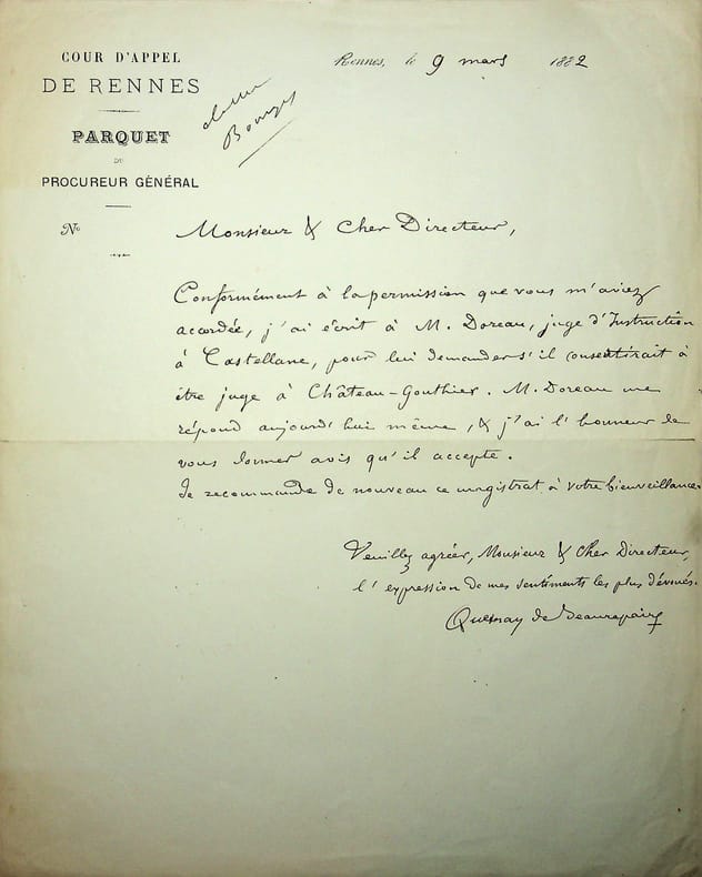 Jules Quesnay de Beaurepaire (1834-1923), magistrat, écrivain. L.A.S., Rennes, 9 mars 1882, 1p in-4. A un directeur. Il lui annonce que M. Doreau a accepté d'être juge à Château-Gontier et le lui recommande. [206]