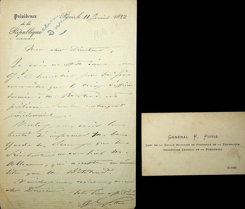 François Pittié (1829-1886), militaire, écrivain. L.A.S., Paris, 11 janvier 1882, 1p in-8. A propos de la croix d'officier de la Légion d'Honneur de M. Bétoland (?). [208]