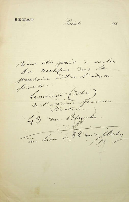 John Lemoinne (1815-1892), journaliste, diplomate, homme politique, membre de l'Académie française. L.A.S., sd, 1p in-8. Au directeur de l'Almanach Didot-Bottin, afin de lui demander de modifier la son adresse dans la prochaine édition. [208]