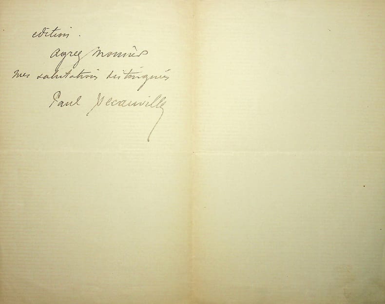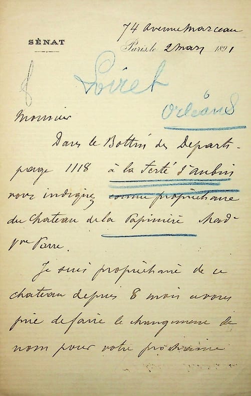 Paul Decauville (1846-1922), inventeur, industriel, homme politique, maire d'Evry-Petit-Bourg, sénateur. L.A.S., Paris, 2 mars 1891, 1p 1/2 in-8. Il demande à ce que le nom du propriétaire du château de la Papinière soit changé dans le Bottin des départs car il en est le propriétaire depuis 8 mois. Peu commun. [208]