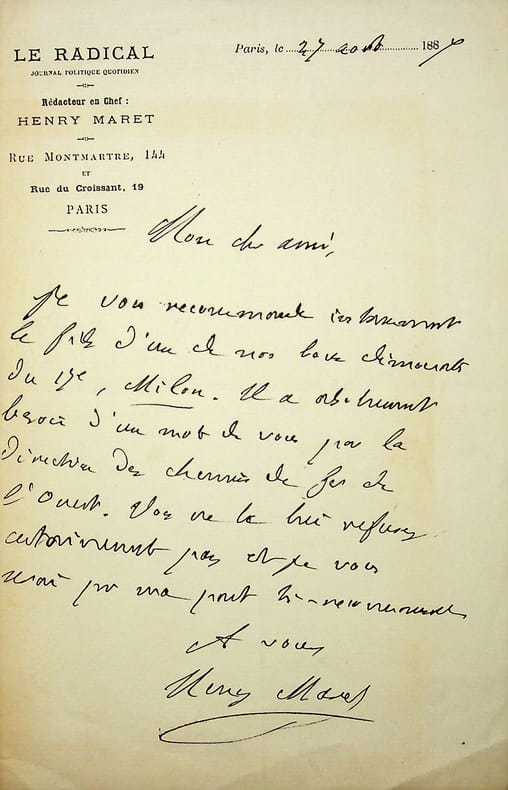 Henry Maret (1837-1917), journaliste, homme politique. L.A.S., 27 août 1887, 1p in-8. Entête du journal Le Radical. Il lui recommande le fils d'un « bon démocrate du 17e » arrondissement, Milon, pour les chemins de fer de l'ouest. [208]