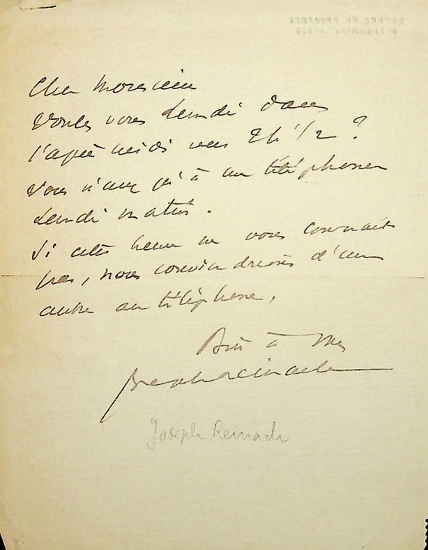 Joseph Reinach (1856-1921), journaliste, homme politique. L.A.S., 12 novembre 1905, 1p in-12. A Xavier Roux (1850-19??), journaliste. Il souhaite fixer un rendez-vous. [208]