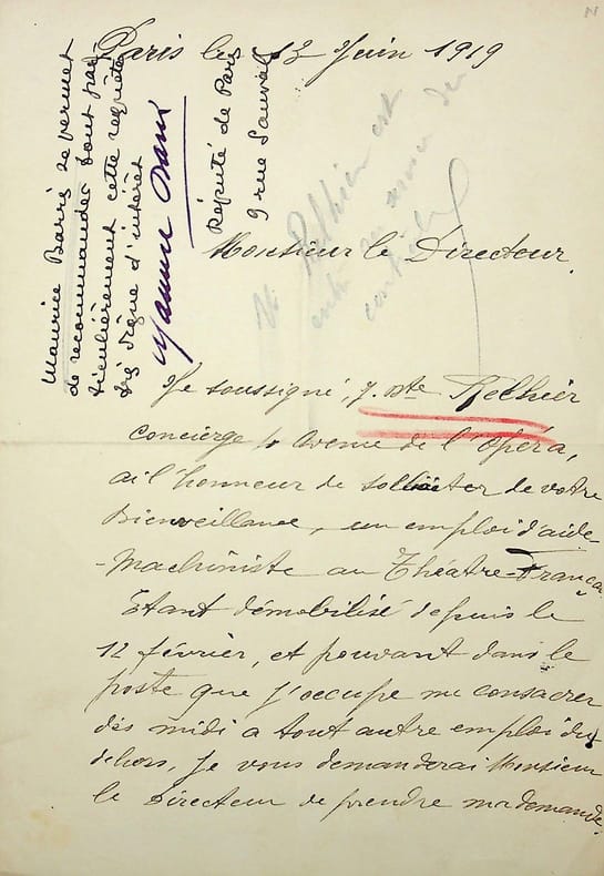 Maurice Barrès (1862-1923), écrivain, homme politique, membre de l'Académie française. P.S., Paris, 13 juin 1919, 1p 1/2 in-8. Sur la lettre d'un concierge désirant devenir machiniste au Théâtre-Français. Il le recommande (seule la signature est autographe). [210]