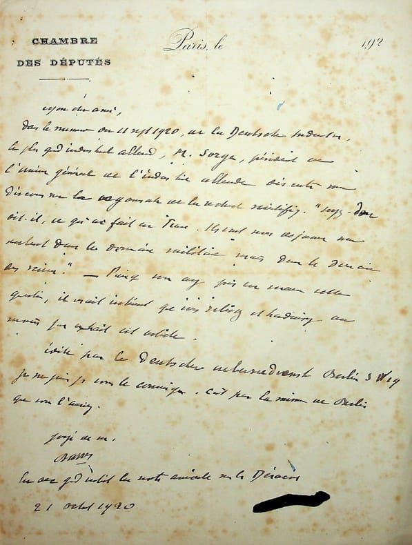 Maurice Barrès (1862-1923), écrivain, homme politique, membre de l'Académie française. L.A.S., 21 octobre 1920, 1p in-4. Longue lettre signalant un article allemand reproduisant un discours de M. Sorge sur la recherche scientifique. [210]