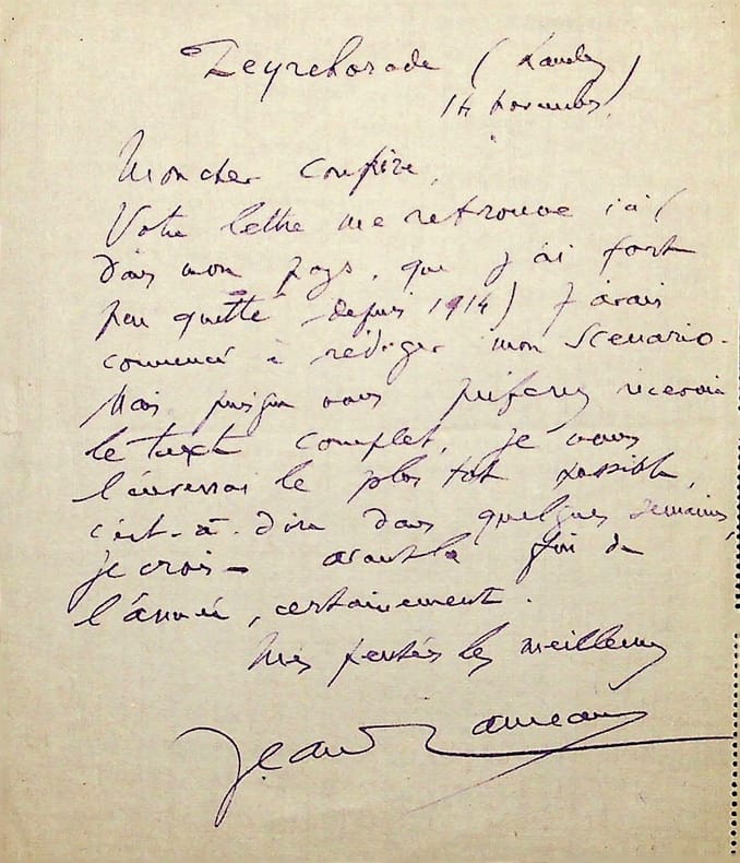 Jean Rameau (1858-1942), poète, romancier, membre des Hydropathes. L.A.S., Peyrehorade, 14 novembre 1919, 1p in-12. A l'écrivain Charles Clerc, de Lectures pour Tous. Il enverra son scénario le plus vite possible. [210]
