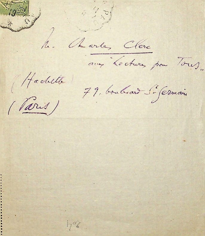Charles Le Goffic (1863-1932), poète, écrivain, membre de l'Académie française. L.A.S., 28 août 1915 (?), 1p in-12. A l'écrivain Charles Clerc, de Lectures pour Tous. A propos d'un article. [211]