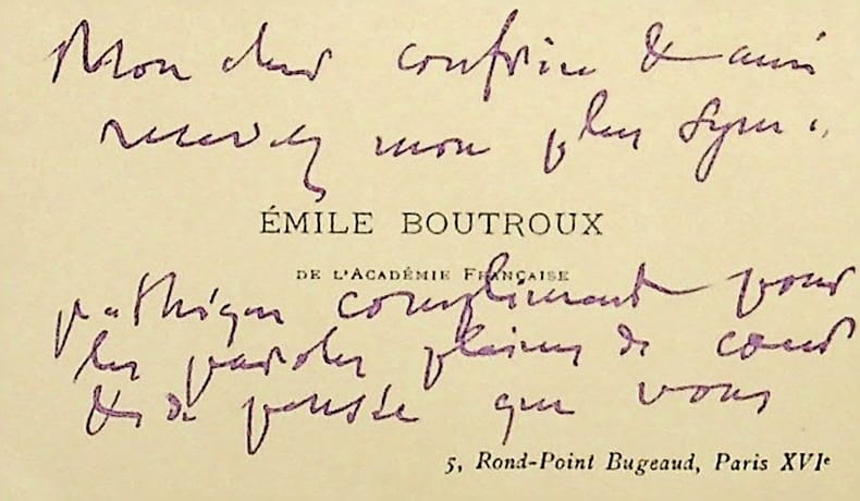 Emile Boutroux (1845-1921), philosophe, membre de l'Académie française. C.A., sd [1917], R°V° (8 lignes). A l'écrivain Charles Clerc, de Lectures pour Tous. « mon cher confrère & ami, recevez mon plus sympathique compliment pour les paroles pleines de coeur & de pensée que vous avez prononcées aux obsèques du bien regretté Théodore de Wyzewa ». [210]