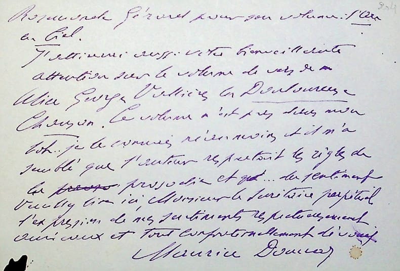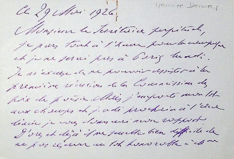 Maurice Donnay (1859-1945), poète, écrivain. L.A.S., 29 mai 1926, 2p in-12. A René Doumic (1860-1937), alors secrétaire perpétuel de l'Académie française. Il ne peut assister à la réunion de la Commission des prix de poésie et souhaite réserver un prix honorable à Rosemonde Gérard (l'épouse d'Edmond Rostand) pour L'Arc en ciel et attire son attention sur le livre d'Alice Georges-Vallières, La douloureuse chanson. Gérard obtint le prix Archon-Despérouses pour son livre en 1926 (prix qu'elle avait déjà obtenu en 1890). En revanche Georges-Vallières n'a pas obtenu de prix en 1926 (mais en obtint un en 1957). [210]