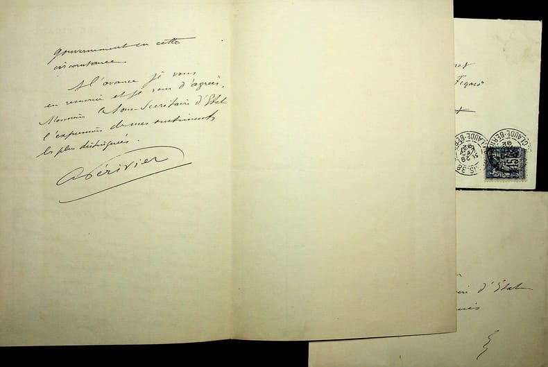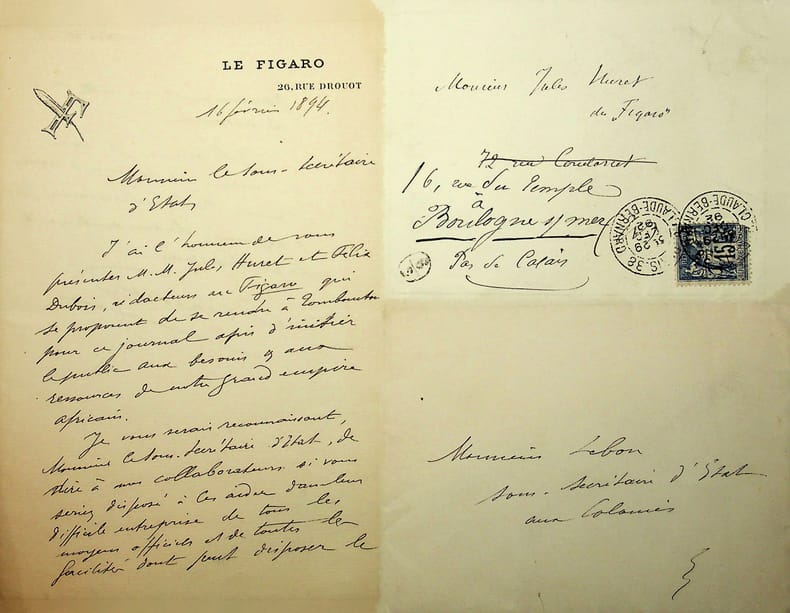 Antonin Périvier (1847-1924), journaliste, co-gérant du Figaro avec Magnard. L.A.S. + enveloppe, 16 février 1894, 1p 1/2 in-8. A Maurice Lebon (1849-1906), avocat, maire de Rouen, alors sous-secrétaire d'état aux Colonies. Recommandation pour Jules Huret (1863-1915) et Félix Dubois (1862-1945) qui vont faire des articles sur l'Afrique. La lettre n'a pas été envoyée à Lebon mais confiée probablement à Huret. On joint une enveloppe vide d'un courrier reçu par Huret. [211]