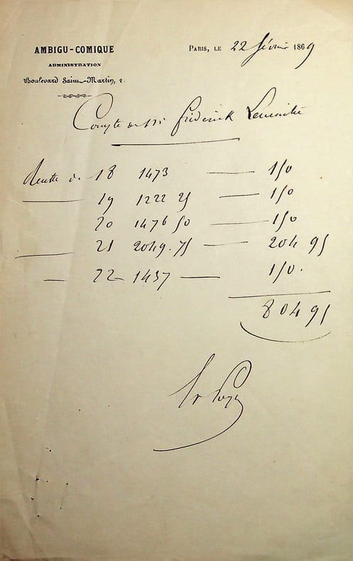 Frédérick Lemaître (1800-1876), acteur. Pièce manuscrite, 22 février 1869, 1p in-8. « Compte de M. Frédérick Lemaitre » avec les sommes qui lui sont dues, écrites par un administrateur non identifié. [211]
