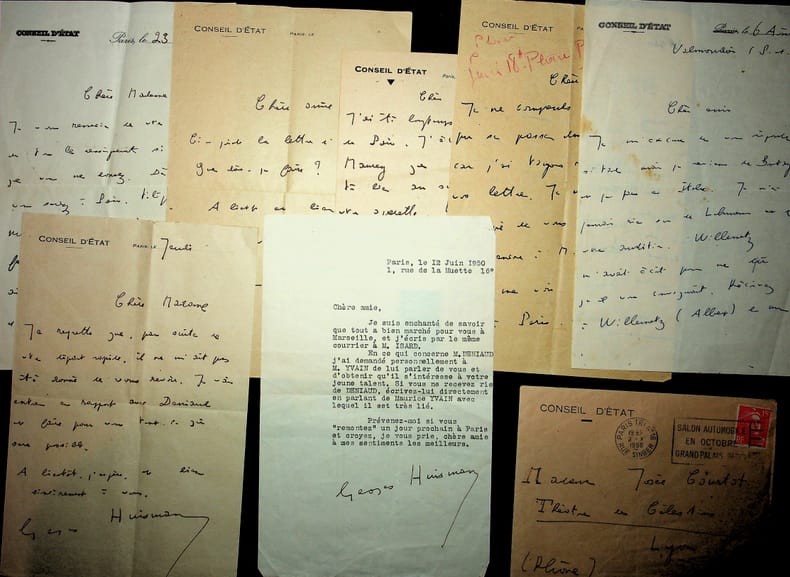 Georges Huisman (1889-1957), haut fonctionnaire, homme politique, historien. 6 L.A.S. & 1 L.S. (1 enveloppe conservée), ca.1950, environ 10p in-12/in-8. A l'actrice d'opérettes Josée Courtot. Toutes les lettres concernent des interventions de Huisman en faveur de Courtot. Mention d'Albert Willemetz. On joint un petit dossier sur Courtot : photos, bulletins de paie, lettres reçues (dont une de Willemetz). [211]