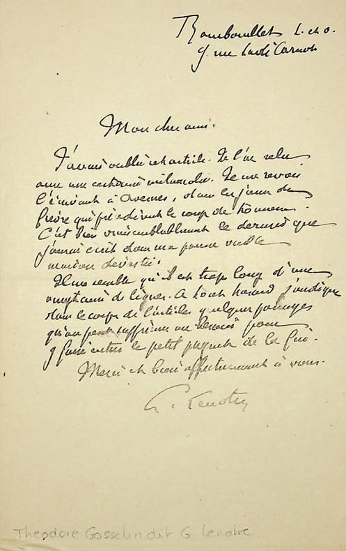 Théodore Gosselin dit G Lenotre (1855-1935), historien, écrivain, membre de l'Académie française. L.A.S., sd, 1p in-8. A l'écrivain Charles Clerc, de Lectures pour Tous. A propos d'un article qu'il avait oublié et qui sera publié dans Lectures pour Tous. [211]
