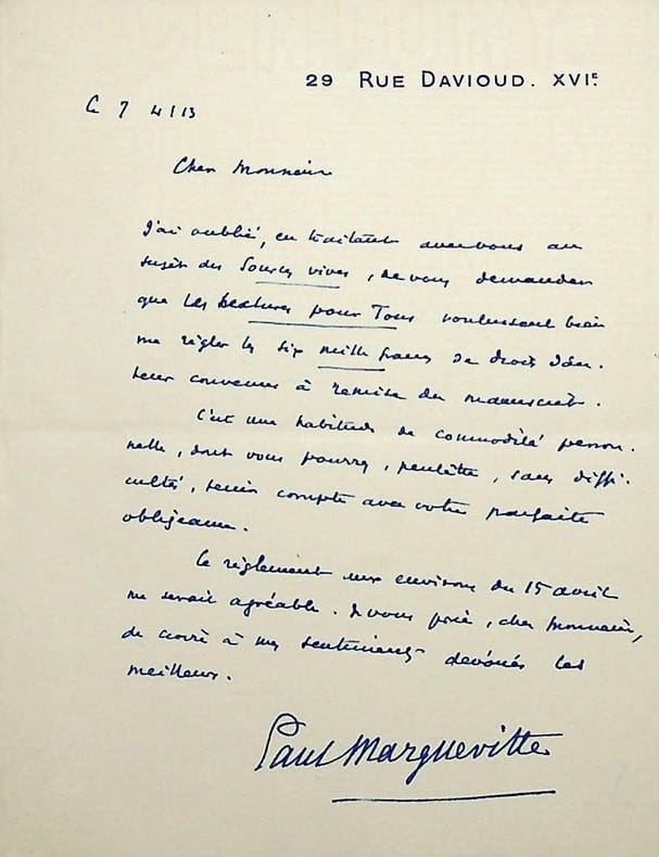 Paul Margueritte (1960-1918), écrivain. L.A.S., 7 avril 1913, 1p in-12. A l'écrivain Charles Clerc, de Lectures pour Tous. Il demande à être payé pour son roman Sources vives publié dans Lectures pour tous. [211]