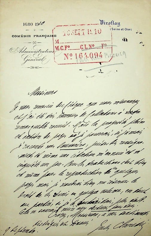 Jules Claretie (1840-1913), écrivain, administrateur général de la Comédie-Française. L.A.S., 9 septembre 1910, 1p in-8. A l'écrivain Charles Clerc, de Lectures pour Tous. Il le remercie pour un paiement et à été heureux de collaborer. [211]
