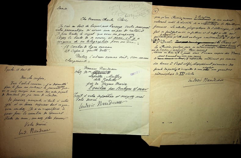 Ludovic Naudeau (1872-1949), écrivain, journaliste. 2 L.A.S. & 1 Manuscrit A.S., 1921, 3p in-8/in-4. A l'écrivain Charles Clerc, de Lectures pour Tous. À propos de ses collaborations dans Lectures pour tous. Le manuscrit est la fin d'un long manuscrit (numéroté 14). [211]