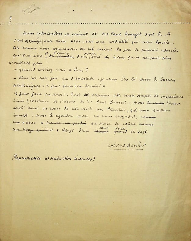 Gérard Bauër (1888-1967), écrivain, président de la Société des Gens de Lettres. Manuscrit A.S., sd, 1p in-4. Fin d'un article publié dans Lectures pour tous. [211]