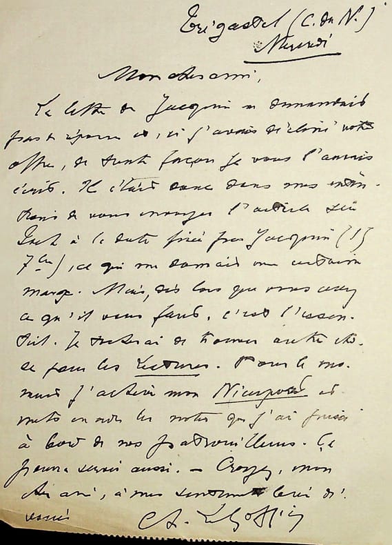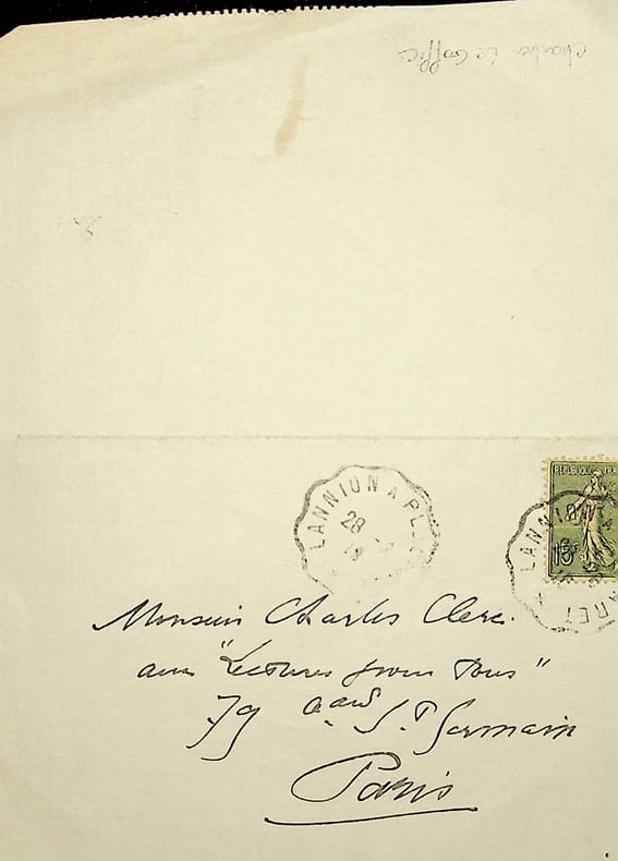 Charles Le Goffic (1863-1932), poète, écrivain, membre de l'Académie française. L.A.S., 28 août 1915 (?), 1p in-12. A l'écrivain Charles Clerc, de Lectures pour Tous. A propos d'un article. [211]