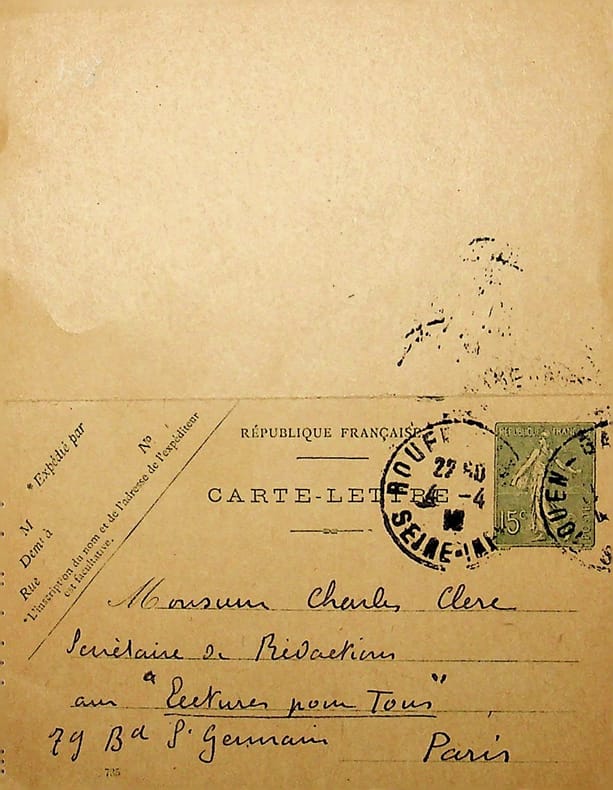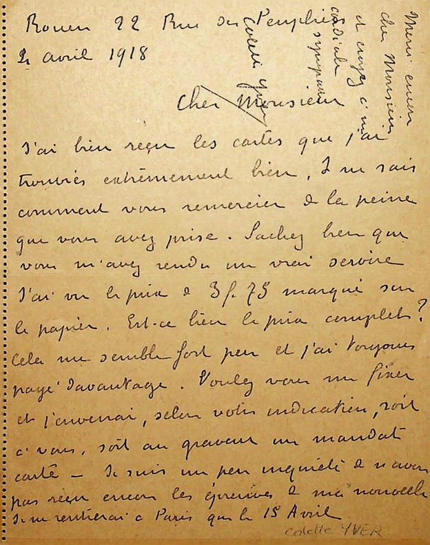Colette Yver (1874-1953), écrivain. L.A.S., 4 avril 1918, 1p in-12. A l'écrivain Charles Clerc, de Lectures pour Tous. Lettre de remerciements. [211]