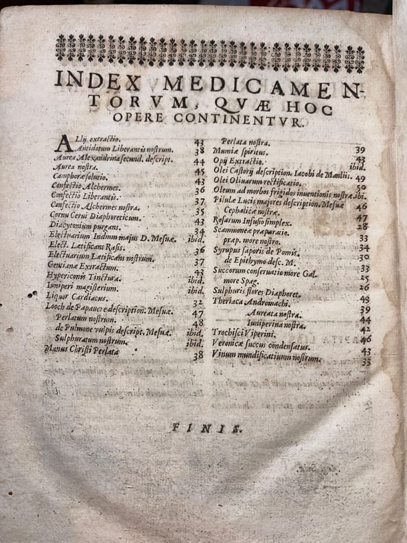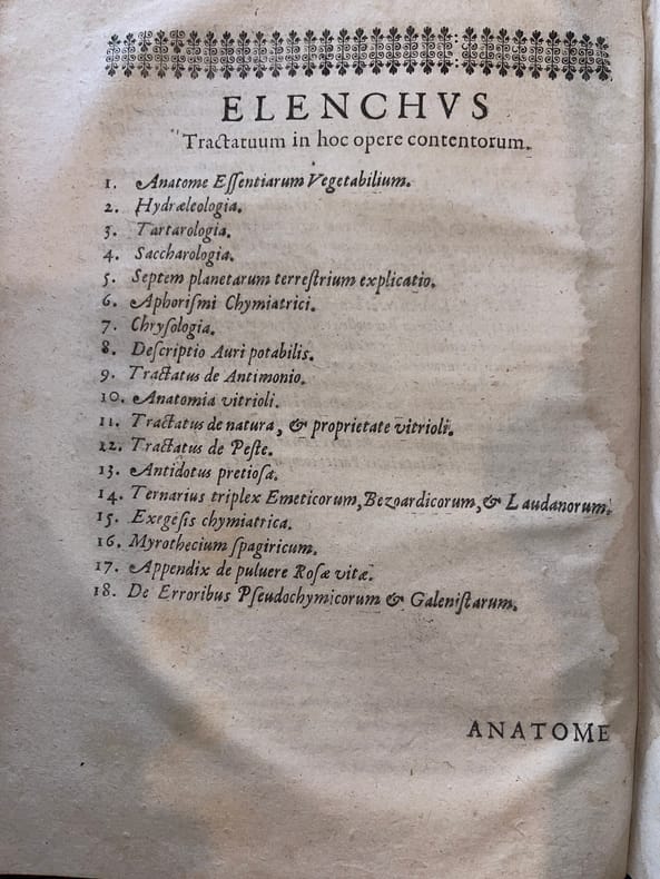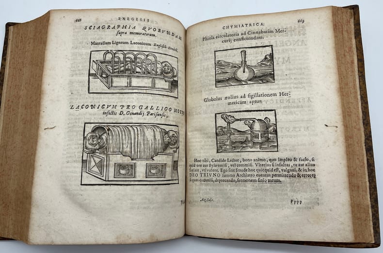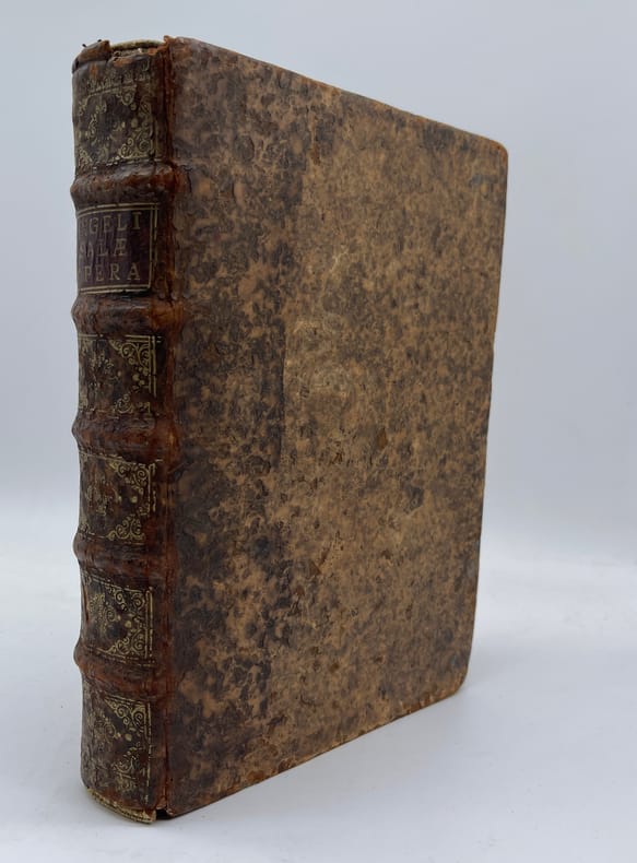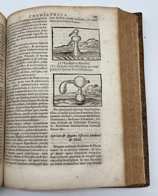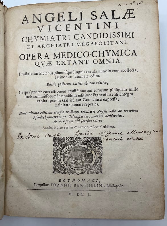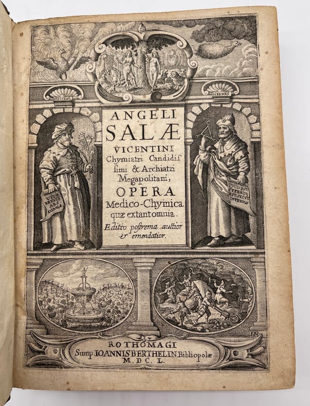 Angelo Sala, Angeli Salae Vicentini Chymiatri Candidissimo et Archiatri Megapolitani. Opera medico-chymica quae extant omnia : Frustulatim hactenus, diversisque linguis excusa, nunc in unum collecta, Latinoque idiomate edita [suivi de] Angeli Salae Vicentini, Medici Spagirici, Tractatus Dup : De Variis tum Chymicorum tum Galenistarum erroribus, in praeparatione Medicinali commissis. Rothomagi [Rouen], Joannis Berthelin [Jean Berthelin], 1650. In-4, front.-[6]-749-[13]-50-[2]p. Saut de pagination de 336 à 341, quelques erreurs de pagination, signature des cahiers continue entre les deux ouvrages. Seconde édition des oeuvres complètes, après celle de Francfort en 1647. Le frontispice de l'édition de 1647 est de Sebastian Furck (c.1589-1666) et a servi de modèle au nôtre, reproduisant fidèlement le dessin. L'ouvrage parle de médecine spagyrique, à cheval entre médecine, chimie et principes d'alchimie. L'édition contient quelques bois gravés. Le second texte est absent de l'édition de 1647. Il fut publié en 1649. Angelo Sala (1576-1637) est un médecin et chimiste Italien, originaire de Vicence. Il passa par la Suisse (Genève) vers 1609, la Hollande entre 1613 et 1617, l'Allemagne (Hambourg) entre 1620 et 1625, fut médecin du duc de Mecklembourg-Güstrow et fut, semble-t-il, reconnu de ses pairs comme Boerhaave. Il meurt à Bützow en Allemagne le 2 octobre 1637, malgré certaines sources qui le disent encore vivant en 1639. Ferguson nous dit : « He was an able physician and an excellent chemist, an admirer and to some extent a follower of Paracelsus ». Hoefer, Nouvelle bibliographie universelle, tome XLIII, col.162 ; Jouin & Descreux, Bibliographie occultiste et maçonnique, n°548 ; Catalogue raisonné in Histoire de la Philosophie hermétique (Paris, Savoye, 1744). Tome III, n°726, p.292 (édition non signalée); Ferguson, II, 316. Provenance : Charles-François Chennet, docteur en médecine de Montargis (« Montargiani »), manuscrit sur le titre, d'époque. Nous ne trouvons toutefois pas trace de ce médecin. Pleine basane, dos à nerfs orné, tranches mouchetées. Reliure vieillie, une coiffe arasée, l'autre en partie manquante, mouille en fond de cahier, petit travail de ver en marge à partir de la p.645. Ouvrage rare.