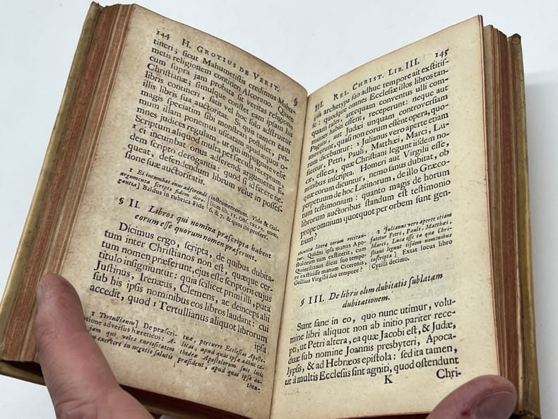 "...Editio Novissima , in qua ejusdem annotationes suis quaeque Paragraphis ad faciliorem usum subjecta sum...", imprimé en latin...... Hugo Grotius (Huig de Groot, ou Hugo de Groot; Delft, (10 avril 1583 - Rostock, 28 août 1645) était un juriste dans les Provinces Unies, il écrivit ce livre défendant le Christianisme, C'était le premier livre protestant dans l'apologétique chrétienne .Grotius représente le premier praticien de l'apologétique légale ou juridique dans la défense de la croyance chrétienne...Brunet 2 colonne 1765...en parfait état (as new condition).
